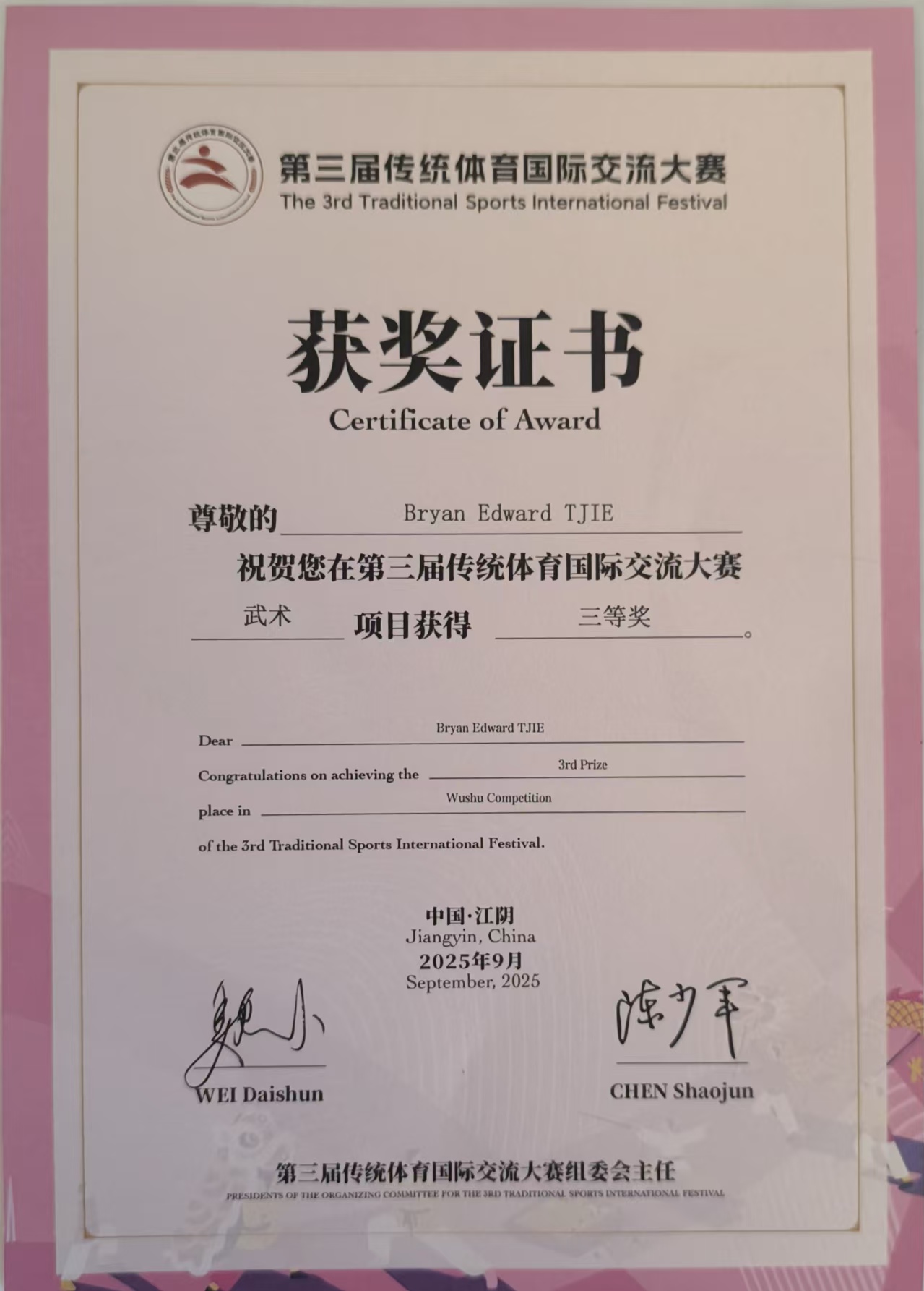 2025年9月21日,第三届传统体育国际交流大赛在江苏省江阴市圆满落幕。我校来华留学生代表印度尼西亚籍齐柏仁凭借精湛的形意拳表演,斩获三等奖,在国际舞台上展现我校来华留学生的体育风采与中华传统体育的魅力。