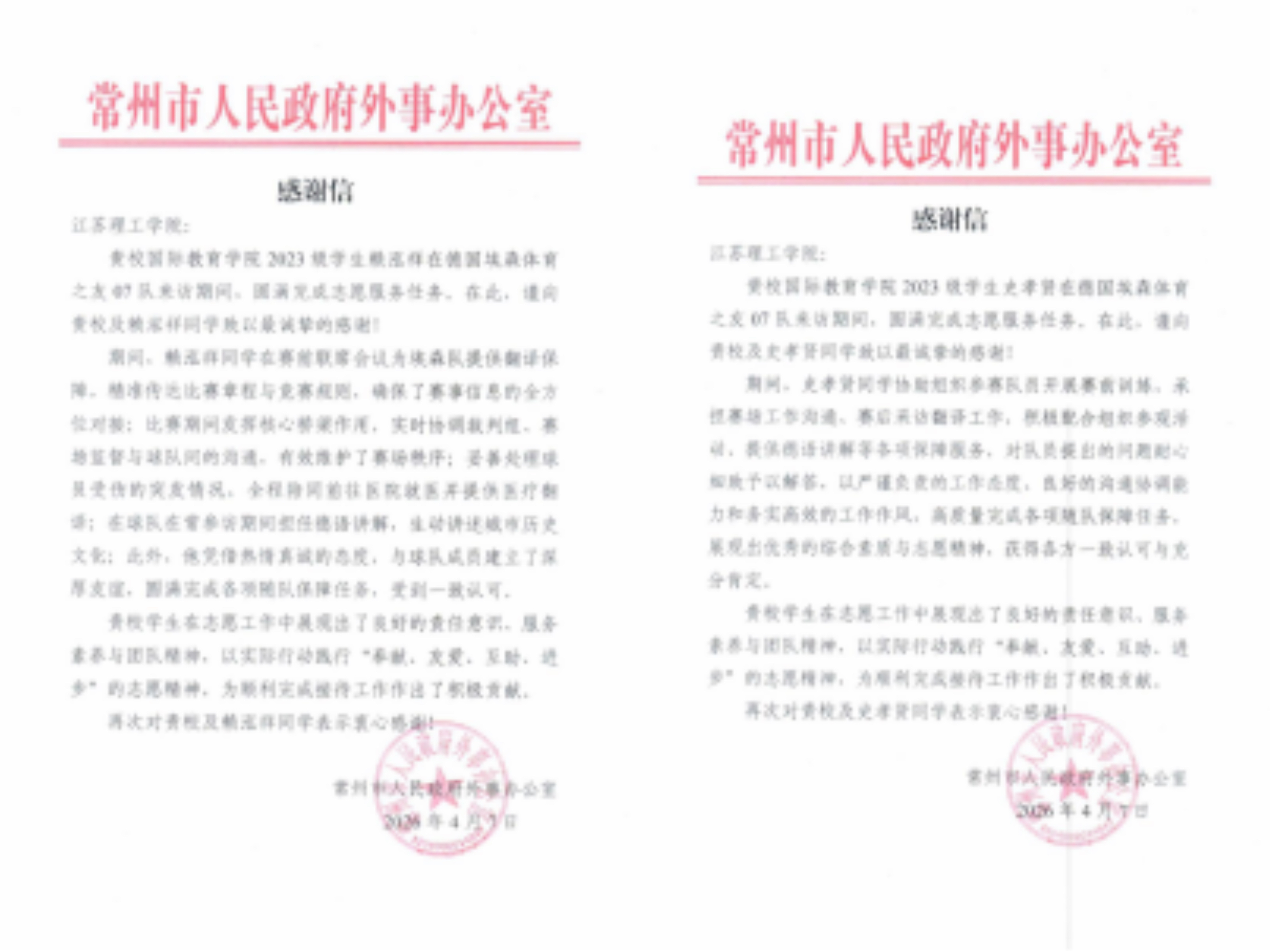 常州市人民政府外事办公室向学校发来感谢信,对两位学生在志愿工作中展现出的良好的责任意识、服务素养和团队精神给予肯定,感谢其为顺利完成接待工作作出的积极贡献。